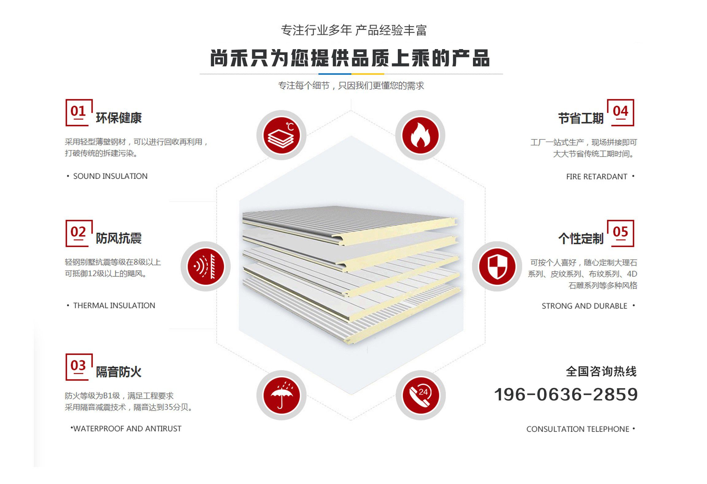 山東尚禾經(jīng)貿(mào)有限公司是集板材設(shè)計、研發(fā)、生產(chǎn)、施工、一體化的科技公司,并在同行業(yè)中率先通過了質(zhì)量、環(huán)境、安全管理體系認(rèn)證。公司2011年投入資金2000余萬元引進世界先進的聚氨酯節(jié)能板連續(xù)生產(chǎn)線、意大利進口發(fā)泡系統(tǒng),采用六組份在線自動操作混合澆注技術(shù),在線一次性完成社會配料中心或工廠的配比混合工藝,并可以根據(jù)溫度在線自動調(diào)整,從而生產(chǎn)處與眾不同的高強度、節(jié)能型、綠色環(huán)保的聚氨酯夾芯板。(其使用年限高于同行業(yè)其他品牌5-10年) 公司主要經(jīng)營范圍包括聚氨酯夾芯板,PU夾芯板,冷庫板,潔凈板,聚氨酯冷庫板,冷庫保溫板的設(shè)計、生產(chǎn)、銷售、技術(shù)指導(dǎo)、安裝及一體、以及進出口業(yè)務(wù),是中部六省最大的綠色節(jié)能建材生產(chǎn)基地。聚氨酯夾芯板年產(chǎn)200萬平方米、PU夾芯板、冷庫保溫板500萬平方米、鏈整產(chǎn)業(yè)綜合實力,開創(chuàng)了六省至中西部創(chuàng)新型中小名企總部基地,并將著力推進中國中西部地區(qū)集成房屋住宅產(chǎn)業(yè)化發(fā)展進程。 科技創(chuàng)新、節(jié)能典范。千萬間始終秉承“誠信、合作”的企業(yè)文化精髓,長期致力于鋼板材結(jié)構(gòu)節(jié)能建筑產(chǎn)業(yè),愿與社會各界攜手合作,共鑄綠色、環(huán)保美好未來。 產(chǎn)品具有良好的絕熱、阻燃、隔音、環(huán)保、耐久性能,可廣泛應(yīng)用于工業(yè)、商用建筑內(nèi)外墻、以及民用建筑外墻保溫、空調(diào)通風(fēng)系統(tǒng)、專用防火保溫門等領(lǐng)域?! ∥覀兪冀K秉承...